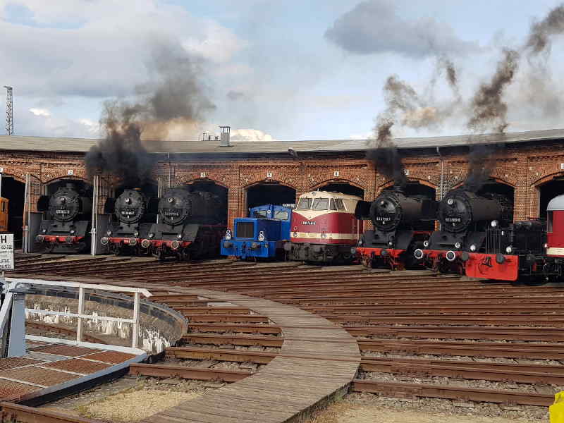 Außerdem steuerte die Eisenbahngesellschaft Potsdam noch einige Exponate für die Lokausstellung im Außengelände bei. Vielen Dank nochmal dafür! Im folgenden Bild erkennt man in dunkelroter Lackierung die Diesellok 221 145 der ehemaligen Deutschen Bundesbahn neben ihrer Schwester 118 692 der Deutschen Reichsbahn.