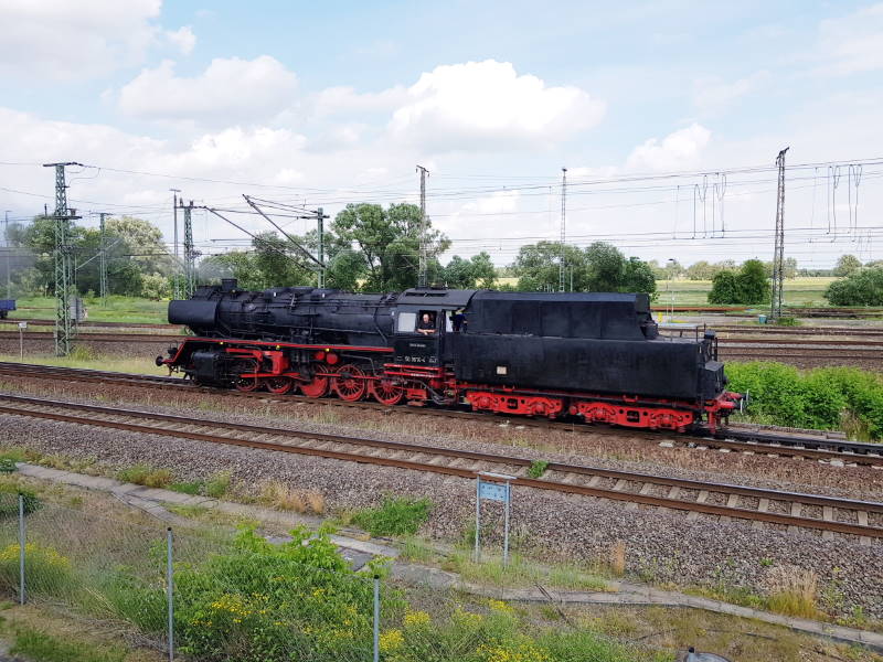 Aber der Reihe nach: Am Freitag vor der Veranstaltung wurden wie üblich die Fahrzeuge arrangiert, die Dampfloks angeheizt und diesmal auch die notwendigen Bodenmarkierungen und Leitsysteme angebracht, um einen geregelten Besucherverkehr mit Abstand zu organisieren. Außerdem wurde 50 3570 zur Probe in Richtung Hafen Wittenberge geschickt, um zu testen, ob die Fahrwerksarbeiten der vergangenen Zeit erfolgreich waren. Die Fahrt wurde zu unserer Zufriedenheit absolviert. Das folgende Foto zeigt die Lok auf dem Weg in den Hafen