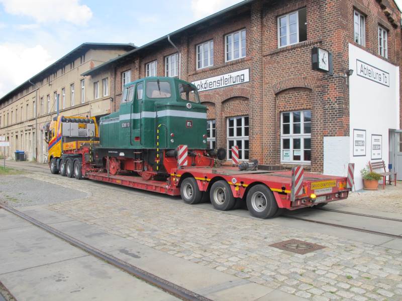 Wir freuen uns über ein neues Exponat im Historischen Lokschuppen Wittenberge. Am Freitag, den 5.8.2016 wurde die Lok des Typs S 200 per Schwertransport angeliefert. Dabei handelt es sich um eine Rangierlokomotive aus dem Hause Linke-Hoffmann-Busch, Salzgitter, die ursprünglich für die Salzgitter-Chemie GmbH geliefert wurde. Die Firma betrieb am Bahnhof Melbeck-Embsen in der Nähe von Lüneburg einen chemieverarbeitenden Betrieb. Nachdem das Werk in den 1980er Jahren geschlossen wurde, wurde die Lok an die Stärkefabrik Wietzendorf verkauft, wo sie im Verschubdienst bei der Kartoffelentladung eingesetzt wurde. Die Lok ist betriebsfähig. Sie verfügt über einen 245 PS starken Dieselmotor mit sechs Zylindern und erreicht eine Höchstgeschwindigkeit von 42 km/h.